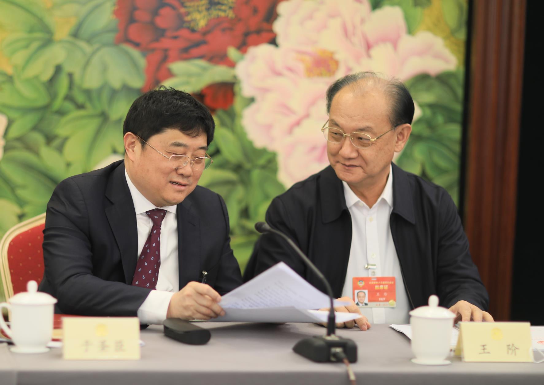 圖為全國政協(xié)委員、北京凱博通投資股份有限公司總裁于圣臣與全國政協(xié)委員、中國中醫(yī)科學(xué)院首席研究員王階在做小組討論。(顧建文 攝)