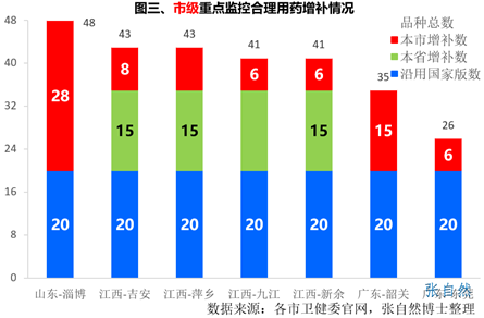 除省級(jí)外,許多地級(jí)市也出臺(tái)了本地的重點(diǎn)監(jiān)控合理用藥藥品目錄,尤其江西省的各地級(jí)市,如江西的吉安、萍鄉(xiāng)各有43個(gè)品種,九江和新余各有41個(gè)品種,并分別在江西省級(jí)版本的基礎(chǔ)上各新增了8個(gè)和6個(gè)品種。