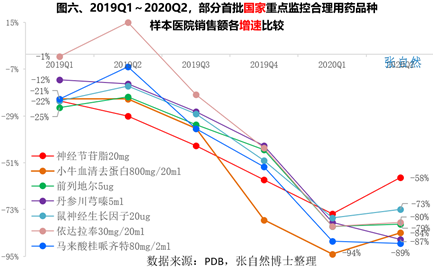 自2019年第一季度開(kāi)始,除依達(dá)拉奉在2019年第二季度唯一出現(xiàn)一次正增長(zhǎng)外,其他時(shí)段每個(gè)季度都在下滑,如長(zhǎng)期穩(wěn)居銷(xiāo)售首位的神經(jīng)節(jié)苷脂(20mg)銷(xiāo)售增速由2019Q1的-22%下降到了2020Q2的-58%,馬來(lái)酸桂哌齊特(80mg/2ml)由2019Q1的-21%下降到了2020Q2的-89%。