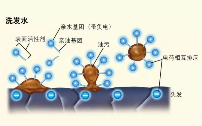 以普通的中性洗發(fā)水為例。使用時(shí),表面活性劑里的親油基團(tuán)與油脂相結(jié)合,當(dāng)與油脂結(jié)合的表面活性劑增加時(shí),油脂就被表面活性劑所包裹,最終逐漸從頭發(fā)上分離。