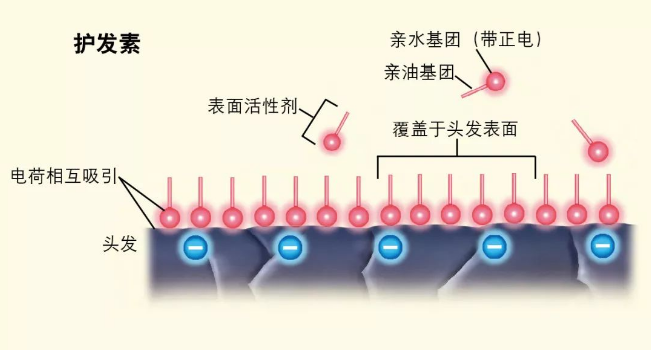 以經(jīng)常與中性洗發(fā)水一同使用的護(hù)發(fā)素為例,護(hù)發(fā)素里加入了使親水基團(tuán)帶正電的表面活性劑,帶正電的表面活性劑與帶負(fù)電的頭發(fā)相吸引,覆蓋于頭發(fā)表面。此時(shí),表面活性劑的親油基團(tuán)都朝向頭發(fā)的外側(cè),且親油基團(tuán)具有易溶于油的性質(zhì),因此,頭發(fā)變得柔軟順滑。