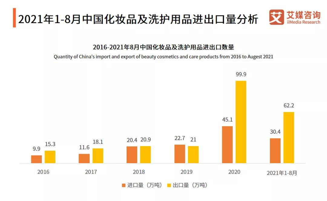 數(shù)據(jù)顯示,2021年1-8月中國化妝品及洗護(hù)用品進(jìn)口數(shù)量為30.4萬噸,同比增長5.8%;出口數(shù)量為62.2萬噸,同比減少3.3%。艾媒咨詢分析師認(rèn)為,2020年及2021年化妝品及洗護(hù)用品出口量在2019年的基礎(chǔ)上大增的主要原因在于疫情之下中國洗護(hù)用品出口增多。隨著中國化妝品市場的監(jiān)管日益完善,中國化妝品產(chǎn)品的質(zhì)量進(jìn)一步得到保證,中國化妝品品牌的長期國際競爭力也有望提升。