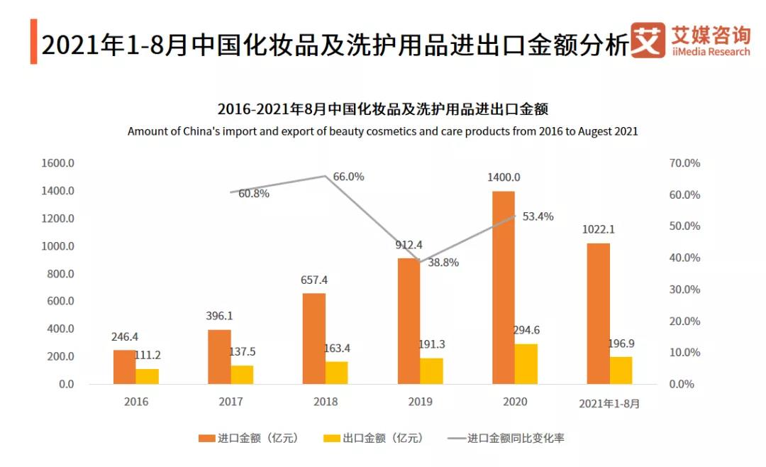 數(shù)據(jù)顯示,2021年1-8月,中國化妝品及洗護(hù)用品進(jìn)口金額為1022.1億元,同比增長21.2%;出口金額為196.9億元,同比增長1.6%。艾媒咨詢分析師認(rèn)為,中國化妝品及洗護(hù)用品進(jìn)口金額持續(xù)高增,反映中國消費(fèi)者對(duì)進(jìn)口化妝品及洗護(hù)用品的消費(fèi)能力的提升,化妝品電商可積極布局化妝品進(jìn)口市場。