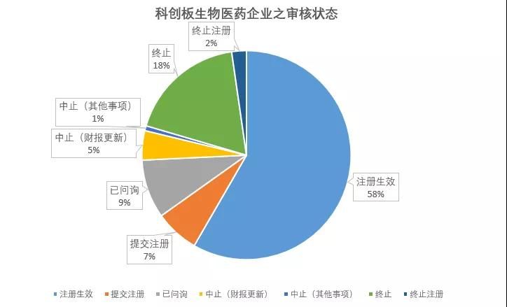 目前已申報科創(chuàng)板的132家生物醫(yī)藥企業(yè)中,共77家已通過證監(jiān)會注冊,占已申報企業(yè)數(shù)量的58%;27家終止了上市審核,占已申報企業(yè)數(shù)量的20%。具體審核狀態(tài)如下圖所示: