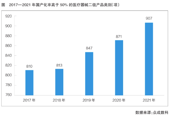 同時,醫(yī)療器械國產(chǎn)化成績顯著。眾成數(shù)科數(shù)據(jù)顯示,2017年,國產(chǎn)化率為0的二級產(chǎn)品類別為74項;2021年,該品類已減少至52項。