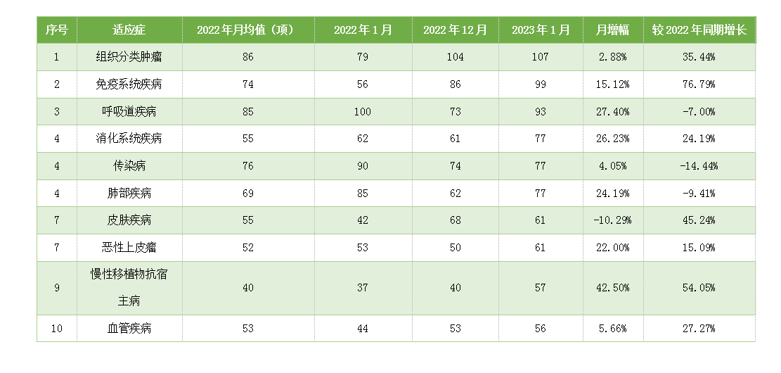從1月份新增臨床試驗(yàn)熱門適應(yīng)癥領(lǐng)域來看,組織分類腫瘤仍為最主要的熱門研發(fā)領(lǐng)域, 試驗(yàn)數(shù)量為107項(xiàng),相較12月份上升 2.88%;其次為免疫系統(tǒng)疾病,但數(shù)量相較于上月上升15.12%。月增幅最高的熱門適應(yīng)癥為慢性移植物抗宿主病,單月增幅均超過40%。僅有皮膚類疾病本月相較上月下降,下降幅度為10.29%。(詳見表1)