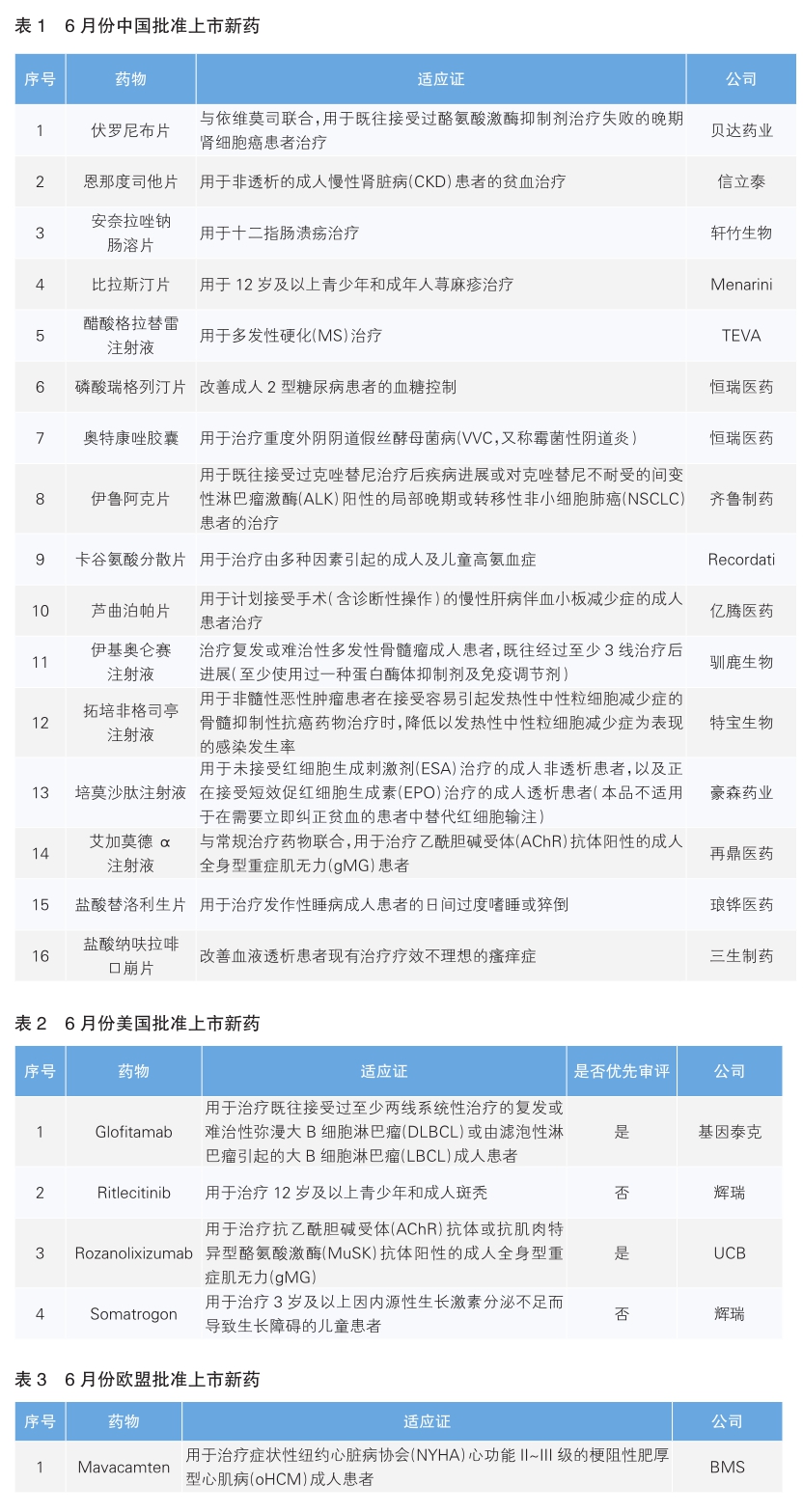 6月份,中國批準(zhǔn)16款新藥上市(詳見表1)。根據(jù)Pharmadigger數(shù)據(jù)庫,伏羅尼布片、安奈拉唑腸溶片、磷酸瑞格列汀片、伊魯阿克片、伊基奧倫塞注射液、拓培非格司亭注射液和培莫沙肽注射液7款藥物為我國自主研發(fā)并在全球范圍內(nèi)首次獲批上市的新藥。