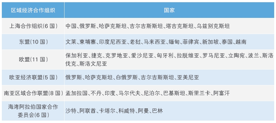 表2 “一帶一路”沿線國家所屬區(qū)域經(jīng)濟(jì)合作組織情況