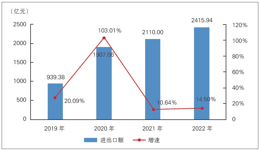 圖 2019—2022 年我國與“一帶一路”沿線國家醫(yī)療器械進(jìn)出口額及增速情況