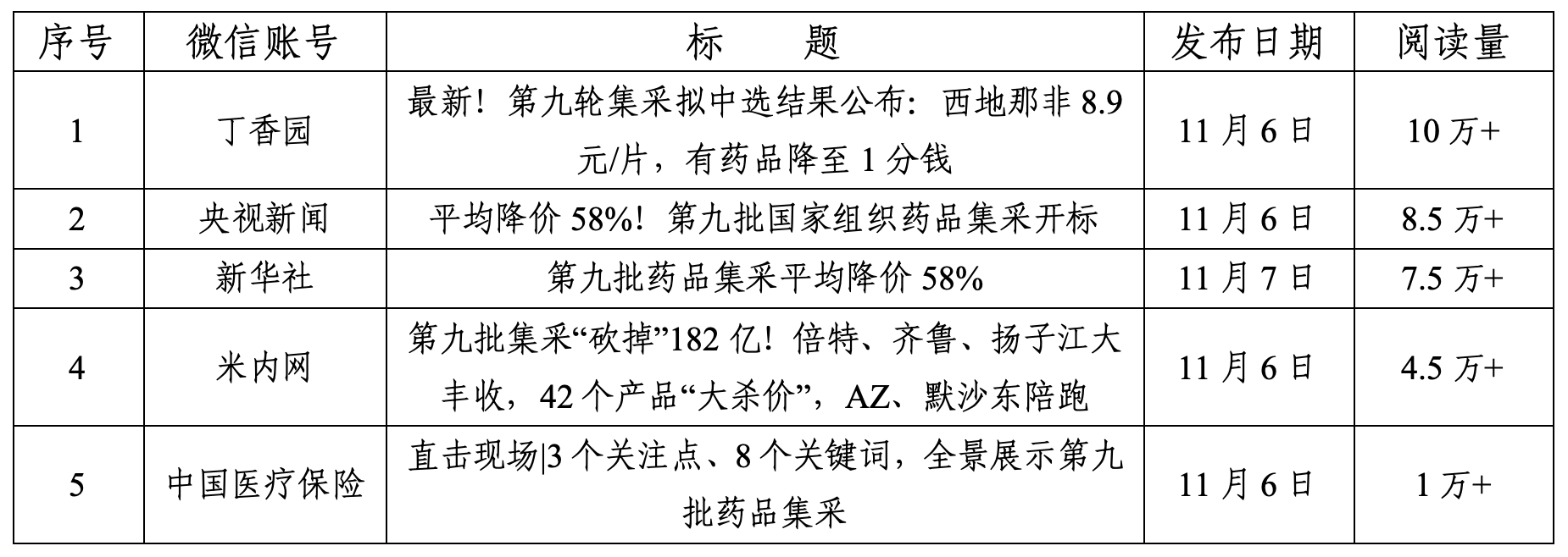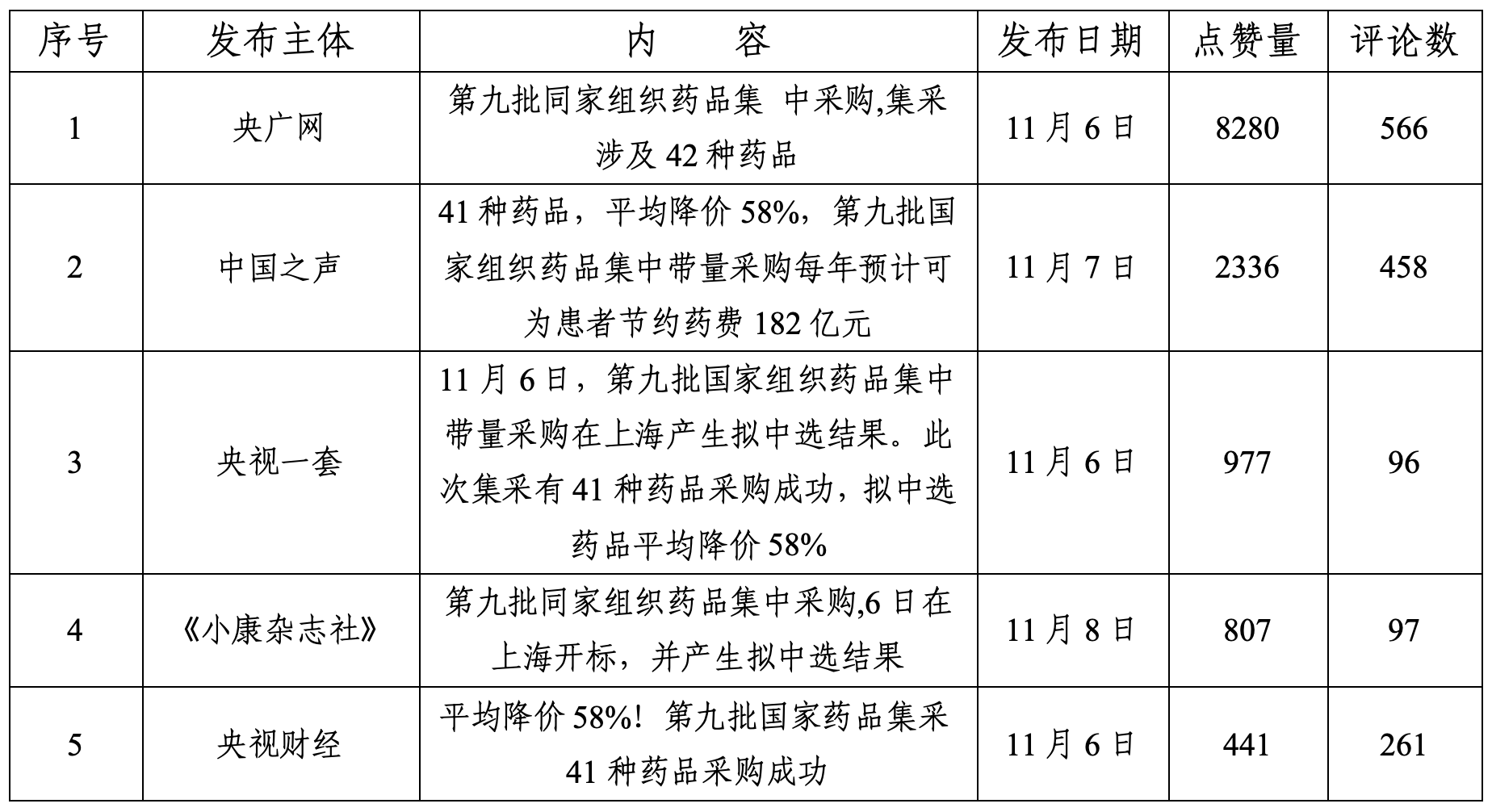 以10月13日—11月10日為監(jiān)測時(shí)間段,新浪微博央視新聞發(fā)布【#第9批國家集采藥品平均降價(jià)58%#】、紅星新聞發(fā)表【平均降價(jià)58%!#第九批國家藥品集采41種藥品采購成功#】關(guān)注度較高。按閱讀量排序,熱門微信如表1所示。按點(diǎn)贊量排序,熱門短視頻如表2所示。
