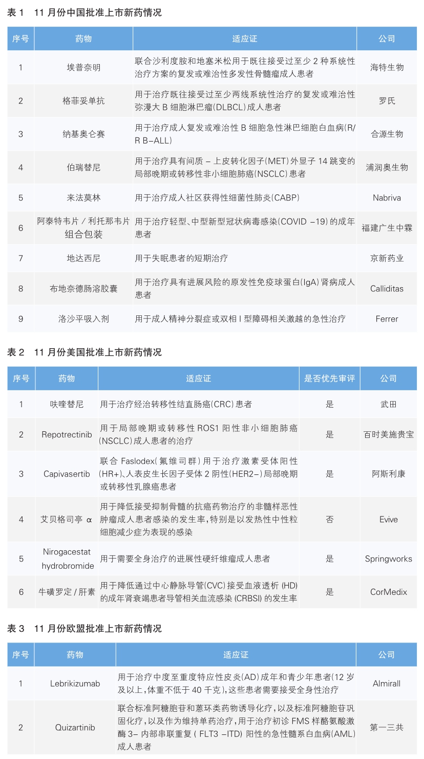 2023年11月份,美國批準了6款新藥上市。根據(jù)Pharmadigger數(shù)據(jù)庫信息,Repotrectinib、Capivasertib、Nirogacestat hydrobromide,以及?;橇_定/肝素4款新藥為全球首次獲批;另外兩款新藥都來自中國藥企,分別是呋喹替尼和艾貝格司亭α。