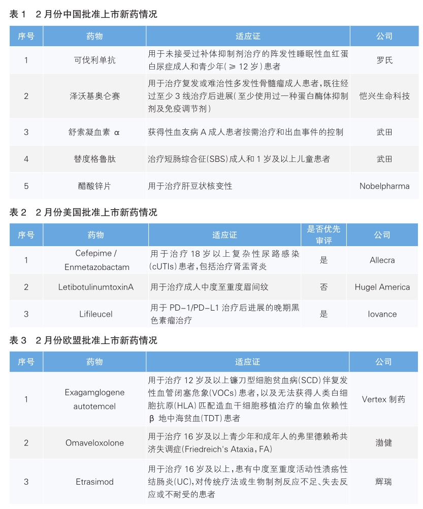 2月份,我國(guó)批準(zhǔn)了5款新藥上市。根據(jù)Pharmadigger數(shù)據(jù)庫(kù),當(dāng)月全球范圍內(nèi)首次獲批上市新藥為可伐利單抗和澤沃基奧侖賽(詳見表1)。