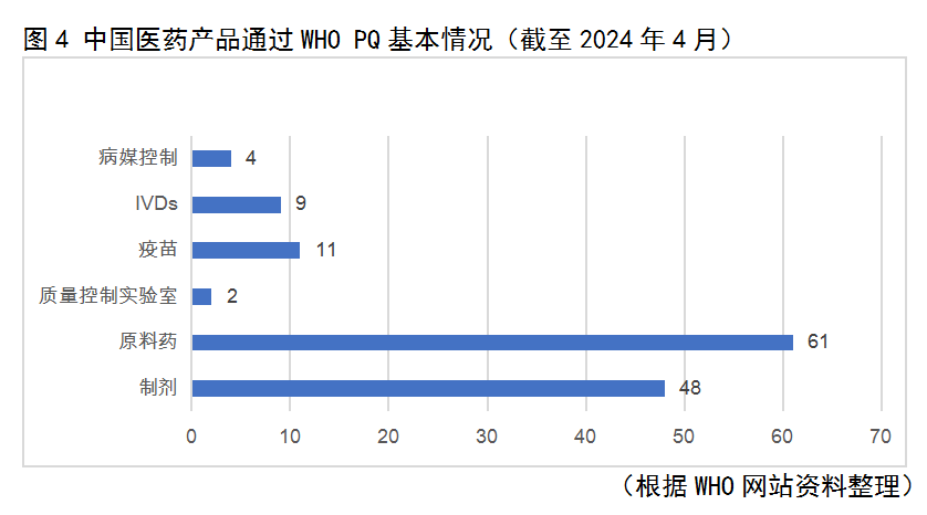 作為全球第一大原料藥生產(chǎn)國(guó),據(jù)統(tǒng)計(jì),2015—2021年,中國(guó)原料藥企業(yè)共獲得707個(gè)歐盟CEP證書(shū)(歐洲藥典適應(yīng)性證書(shū)),居全球第二位;截至2023年7月,在美國(guó)獲DMF(藥物管理檔案)注冊(cè)3743個(gè)。在創(chuàng)新藥領(lǐng)域,截至2023年底,已有8款國(guó)產(chǎn)創(chuàng)新藥成功闖關(guān)美國(guó)。同時(shí),中國(guó)醫(yī)藥產(chǎn)品在參與世界衛(wèi)生組織預(yù)認(rèn)證(WHO PQ)方面也取得了不錯(cuò)成績(jī)(詳見(jiàn)圖4)。