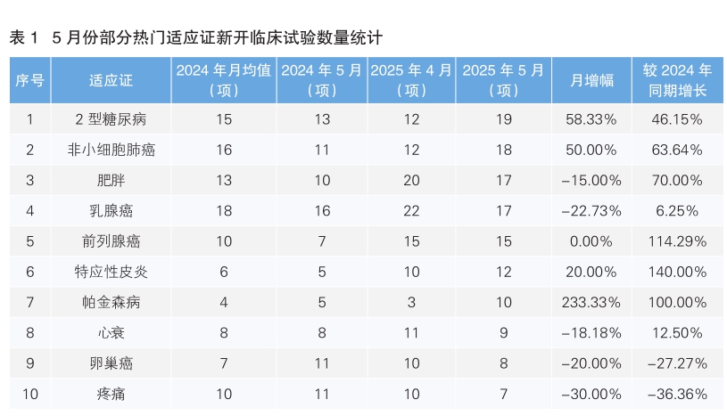 從5月份新開(kāi)臨床試驗(yàn)熱門適應(yīng)證來(lái)看,2型糖尿病為最主要的熱門研發(fā)領(lǐng)域,新開(kāi)試驗(yàn)19項(xiàng),相較4月份上漲58.33%,相較去年同期上漲46.15%。其次為非小細(xì)胞肺癌,新開(kāi)臨床試驗(yàn)數(shù)量環(huán)比上漲50%,同比上漲63.64%。值得注意的是,5月份新開(kāi)臨床試驗(yàn)數(shù)量上升幅度最大的熱門適應(yīng)證為帕金森病,由4月份的3項(xiàng)上升為10項(xiàng),上升幅度為233.33%。除此之外,相較于去年同期,新開(kāi)臨床試驗(yàn)數(shù)量上漲幅度最大的適應(yīng)證為特應(yīng)性皮炎,由5項(xiàng)上升為12項(xiàng),上漲幅度為140%;數(shù)量下降幅度最大的適應(yīng)證為疼痛,由11項(xiàng)下降為7項(xiàng),下降36.36%。(詳見(jiàn)表1)