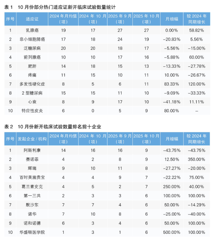 從10月份新開臨床試驗熱門適應證來看,乳腺癌為最主要的熱門研發(fā)領(lǐng)域,新開臨床試驗27項,環(huán)比持平,同比上漲58.82%。其次為非小細胞肺癌,新開臨床試驗19項,環(huán)比下降20.83%,同比上漲5.56%。值得注意的是,10月份新開臨床試驗數(shù)量上升幅度最大的熱門適應證為多發(fā)性硬化癥,由9月份的6項上升至11項,上升幅度為83.33%;新開臨床試驗數(shù)量下降幅度最大的適應證為心衰,由9月份的17項下降到10項,下降幅度為41.18%。(詳見表1)