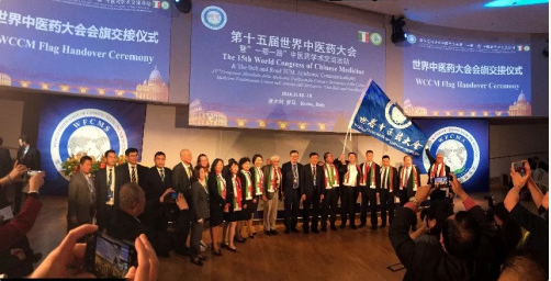 匈牙利中醫(yī)藥團(tuán)隊(duì)在羅馬大會(huì)上隆重接下第16屆世界中醫(yī)藥大會(huì)會(huì)旗