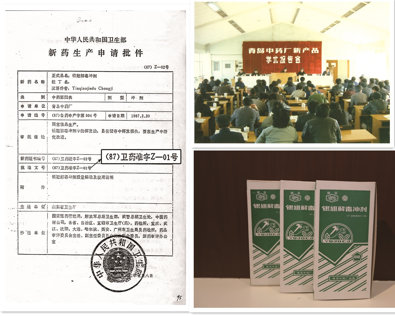 1987年青島中藥廠銀翹解毒沖劑獲衛(wèi)生部頒發(fā)的第一個(gè)生產(chǎn)文號(hào)
