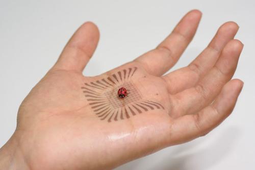 可伸縮的電子皮膚 美國斯坦福大學(xué)的研究人員研發(fā)了一種可伸縮的電子皮膚,能夠?yàn)榧僦b置帶來觸感。這種電子皮膚可以緊緊地纏繞在假肢上,且非常敏感,以至于能夠感覺到瓢蟲爬行的觸感。