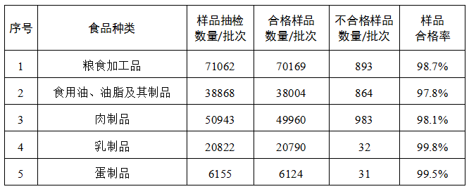 數(shù)據(jù)顯示,大宗食品的合格率保持基本穩(wěn)定,其中糧食加工品,肉制品,蛋制品,乳制品,食用油、油脂及其制品的合格率分別為98.7%、98.1%、99.5%、99.8%、97.8%,均高于總體合格率。