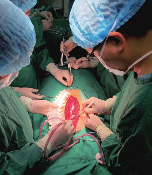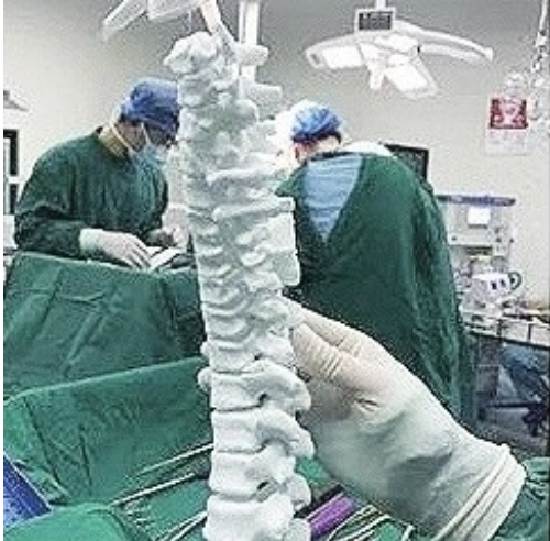 圖為應(yīng)用3D打印脊柱模型輔助脊柱矯形手術(shù)。國家增材制造創(chuàng)新中心供圖