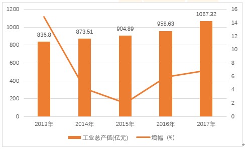 2017年,上海市生物醫(yī)藥工業(yè)總產(chǎn)值首次突破1000億元,同比增長(zhǎng)6.9%(見下圖)。另據(jù)上海市科委數(shù)據(jù)顯示,上海市2017年生物醫(yī)藥產(chǎn)業(yè)經(jīng)濟(jì)總量達(dá)到3046.42億元,同比增長(zhǎng)5.82%。