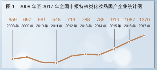 原國(guó)家食藥監(jiān)總局化妝品生產(chǎn)許可信息管理系統(tǒng)服務(wù)平臺(tái)的數(shù)據(jù)顯示,2008年至2017年,全國(guó)申報(bào)特殊類化妝品的生產(chǎn)企業(yè)數(shù)量,除2010年和2011年受政策調(diào)整略有下降外,總體呈遞增趨勢(shì)(見圖1)。2017年,更是達(dá)到1270家企業(yè)的申報(bào)記錄,比2008年的659家增長(zhǎng)了92.7%。
