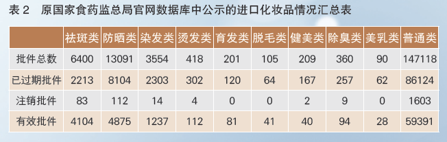 按照產(chǎn)品和產(chǎn)品類別來(lái)統(tǒng)計(jì),截至2017年11月3日,原國(guó)家食藥監(jiān)總局官網(wǎng)數(shù)據(jù)庫(kù)中公示的信息顯示,監(jiān)管部門共批準(zhǔn)國(guó)產(chǎn)特殊用途化妝品總批件33243件,其中過(guò)期產(chǎn)品批件21503件,注銷產(chǎn)品批件141件,有效產(chǎn)品批件11599件;共批準(zhǔn)進(jìn)口特殊用途化妝品172750件,其中過(guò)期產(chǎn)品批件102588件,注銷產(chǎn)品批件1817件,有效產(chǎn)品批件68345件(見表2)。