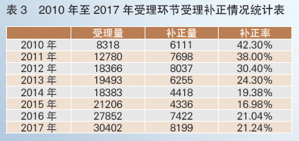同時(shí),統(tǒng)計(jì)化妝品受理環(huán)節(jié)的受理量和補(bǔ)正量(不含延期再審、申請(qǐng)復(fù)核、完善資料)可以發(fā)現(xiàn),從2010年至2015年,化妝品受理環(huán)節(jié)的補(bǔ)正率逐步降低;2016至2017年的補(bǔ)正量略有上升。造成這一現(xiàn)象的主要原因是政策的變化,分別是2010年4月1日起施行的856號(hào)文、2011年4月1日起施行的《關(guān)于實(shí)施化妝品產(chǎn)品技術(shù)要求規(guī)范有關(guān)問題的通知》和2016年12月1日施行的新版《化妝品安全技術(shù)規(guī)范》(見表3)。