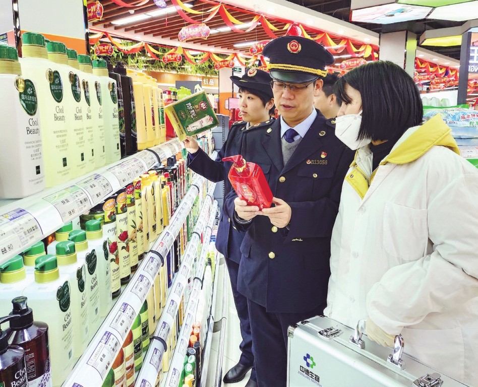 近日,江西省于都縣市場監(jiān)管局組織開展了超市、商場、專賣店、藥店化妝品安全檢查,重點對祛斑美白、祛痘、面膜、防曬類化妝品及燙染發(fā)產(chǎn)品進行針對性檢查,及時發(fā)現(xiàn)化妝品安全隱患,保障產(chǎn)品質(zhì)量安全。圖為該局執(zhí)法人員在一家超市檢查。王雨林 謝峰 攝