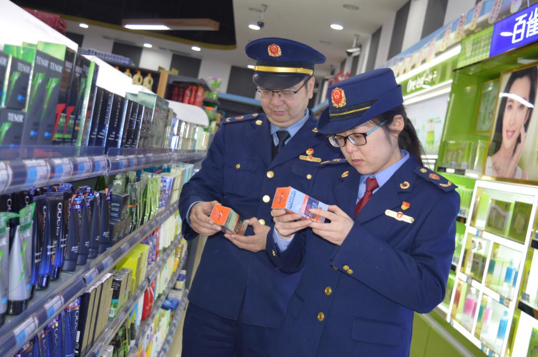 圖為該局執(zhí)法人員正在一家超市對(duì)一款美白保濕類套裝外包裝進(jìn)行檢查。孫建新 周建莉 攝影報(bào)道