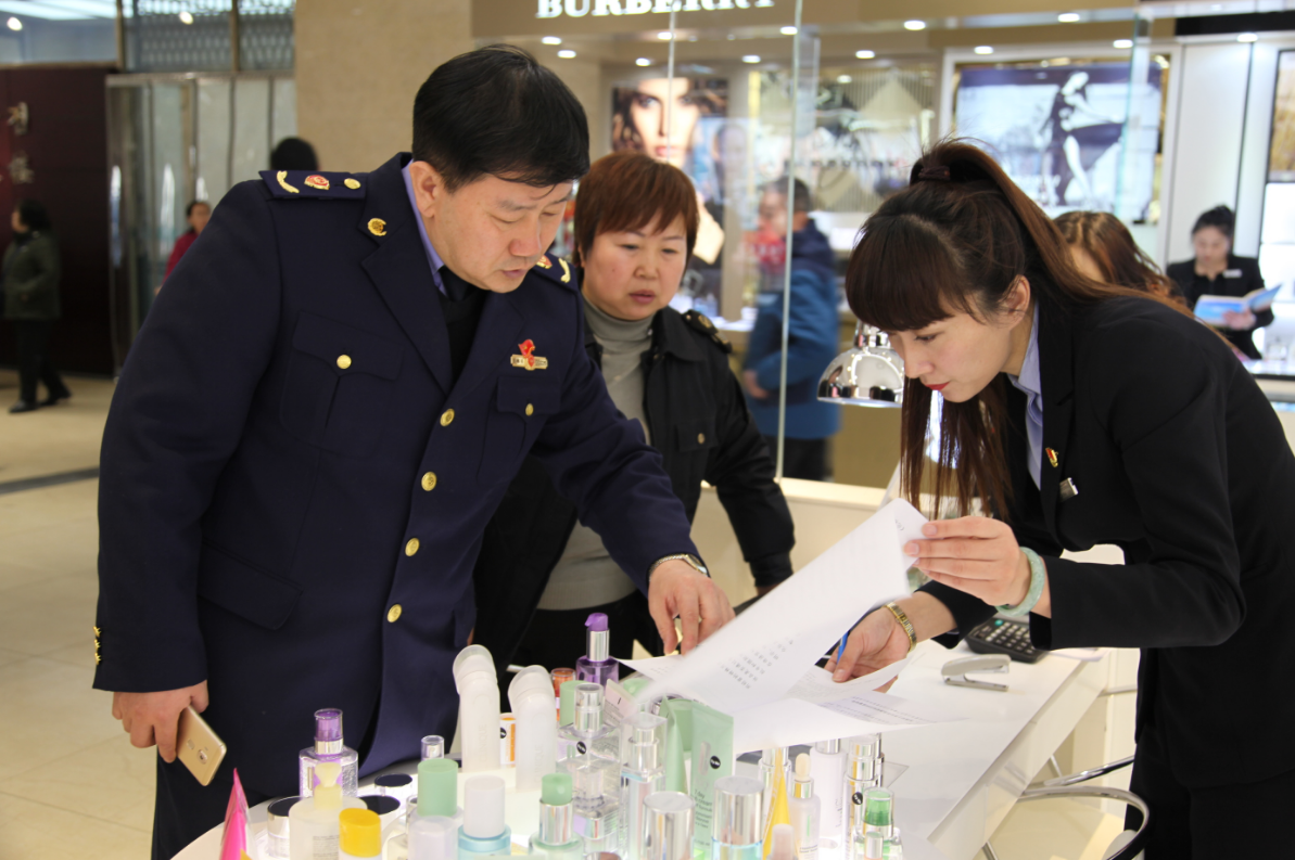 圖為執(zhí)法人員在延吉百貨大樓化妝品專柜進行檢查