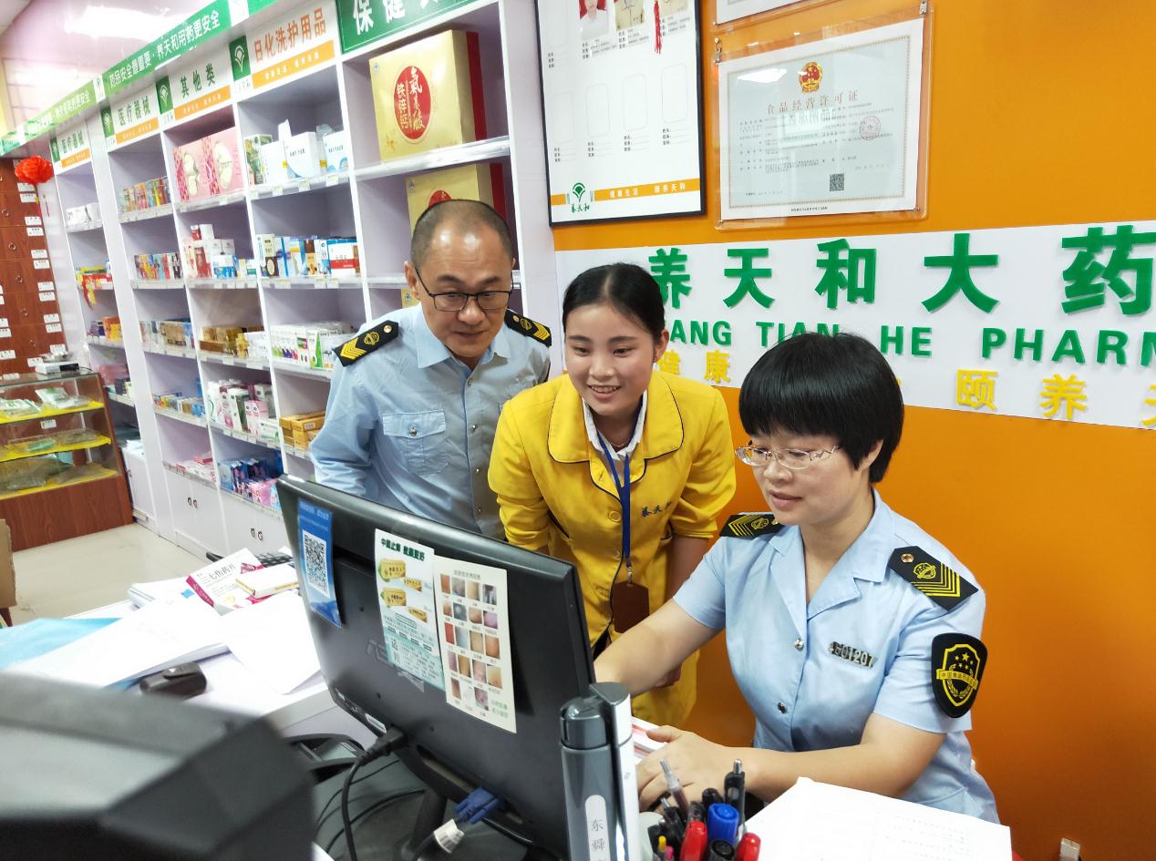 ??谑乘幈O(jiān)管局執(zhí)法人員在藥店突擊排查。記者 范南虹 攝
