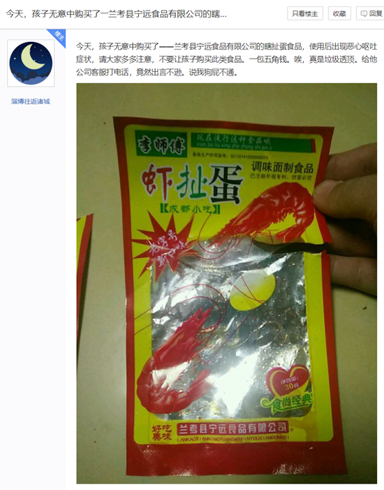 在晚會上,特別提及了辣條的品牌為“蝦扯蛋辣條”。目前淘寶和京東都搜索不到“蝦扯蛋辣條”。記者在網(wǎng)上搜索了有關(guān)“蝦扯蛋辣條”的信息,發(fā)現(xiàn)在2018年初就有網(wǎng)民在網(wǎng)上曝光“蝦扯蛋辣條”,稱孩子購買食用后出現(xiàn)惡心、嘔吐等癥狀。