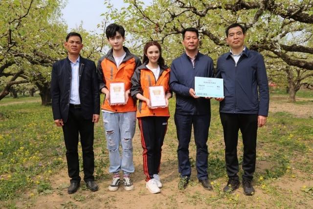 演員陳星旭、彭小苒與碭山縣副縣長(zhǎng)朱明春(右一)、副縣長(zhǎng)薛勇(右二)在碭山梨園。