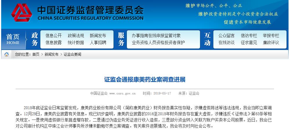 證監(jiān)會表示,2018年底證監(jiān)會日常監(jiān)管發(fā)現(xiàn),康美藥業(yè)股份有限公司(簡稱康美藥業(yè))財務(wù)報告真實(shí)性存疑,涉嫌虛假陳述等違法違規(guī),證監(jiān)會當(dāng)即立案調(diào)查。12月29日,康美藥業(yè)披露有關(guān)信息。