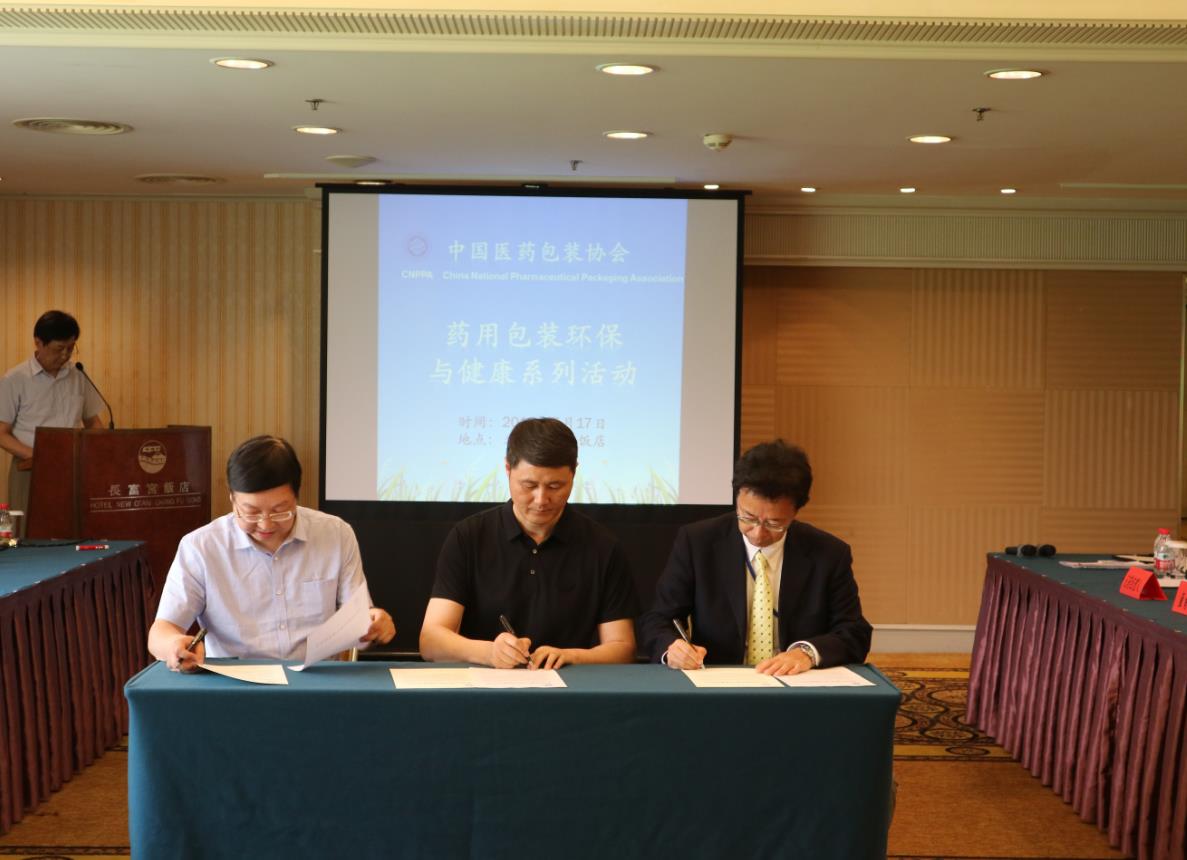 3家企業(yè)簽署《中國醫(yī)藥包裝協(xié)會藥用包裝環(huán)保與健康倡議書》。記者 郭婷 攝