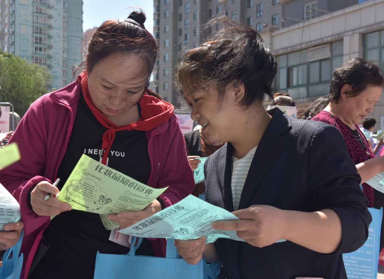 山東省審評認證中心邀請化妝品安全專家走進羊頭峪社區(qū),與消費者面對面交流。