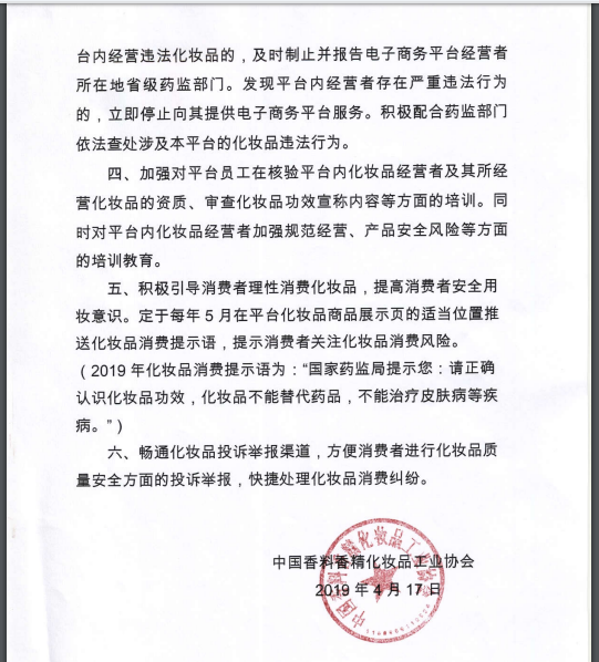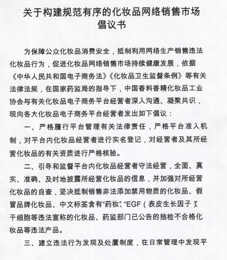 為促進(jìn)化妝品網(wǎng)絡(luò)銷(xiāo)售市場(chǎng)持續(xù)健康發(fā)展,國(guó)家藥監(jiān)局化妝品監(jiān)管司充分調(diào)動(dòng)行業(yè)積極性,指導(dǎo)中國(guó)香料香精化妝品工業(yè)協(xié)會(huì)發(fā)布《關(guān)于構(gòu)建規(guī)范有序的化妝品網(wǎng)絡(luò)銷(xiāo)售市場(chǎng)倡議書(shū)》(以下簡(jiǎn)稱《倡議書(shū)》)?!冻h書(shū)》于4月17日發(fā)布,隨后阿里巴巴、京東、聚美優(yōu)品、唯品會(huì)、網(wǎng)易嚴(yán)選、網(wǎng)易考拉、拼多多、小紅書(shū)8家主流化妝品電子商務(wù)平臺(tái)相繼簽署承諾書(shū),承諾將嚴(yán)格履行電商平臺(tái)管理有關(guān)法律責(zé)任,自覺(jué)抵制利用網(wǎng)絡(luò)生產(chǎn)銷(xiāo)售違法化妝品行為。4月30日,國(guó)家藥監(jiān)局又在全國(guó)范圍內(nèi)部署開(kāi)展“線上凈網(wǎng)線下清源”專(zhuān)項(xiàng)工作,排查處置化妝品網(wǎng)絡(luò)銷(xiāo)售市場(chǎng)安全風(fēng)險(xiǎn),督促化妝品網(wǎng)絡(luò)銷(xiāo)售者和化妝品電子商務(wù)平臺(tái)經(jīng)營(yíng)者落實(shí)化妝品經(jīng)營(yíng)者主體責(zé)任。5月伊始,上述8家電子商務(wù)平臺(tái)又同步上線化妝品消費(fèi)提示語(yǔ)“國(guó)家藥監(jiān)局提示您:請(qǐng)正確認(rèn)識(shí)化妝品功效,化妝品不能替代藥品,不能治療皮膚病等疾病”,提醒廣大消費(fèi)者防范化妝品消費(fèi)風(fēng)險(xiǎn)。