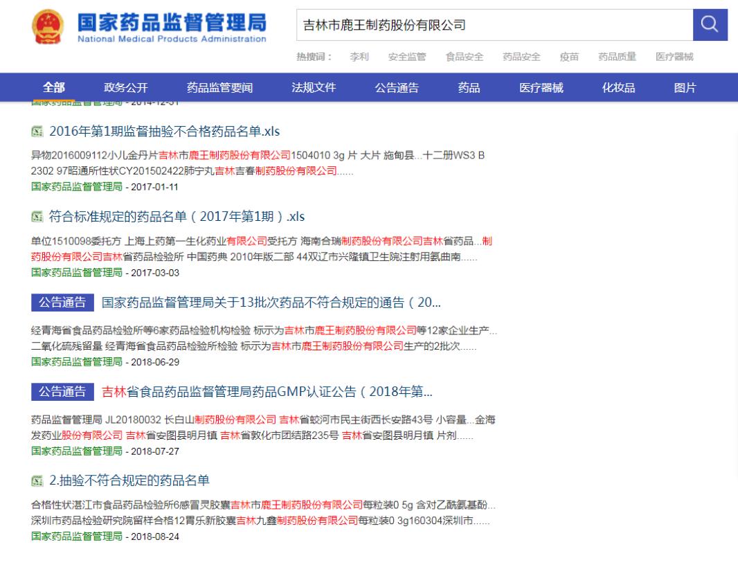 記者查閱國家藥監(jiān)局官網(wǎng)得知,在2018年8月24日、2018年7月3日、2018年2月13日、2017年1月11日國家藥品監(jiān)管部門發(fā)布的藥品不合格名單與不符合標準規(guī)定的藥品名單中,都出現(xiàn)了標示為吉林市鹿王制藥股份有限公司生產(chǎn)的產(chǎn)品。