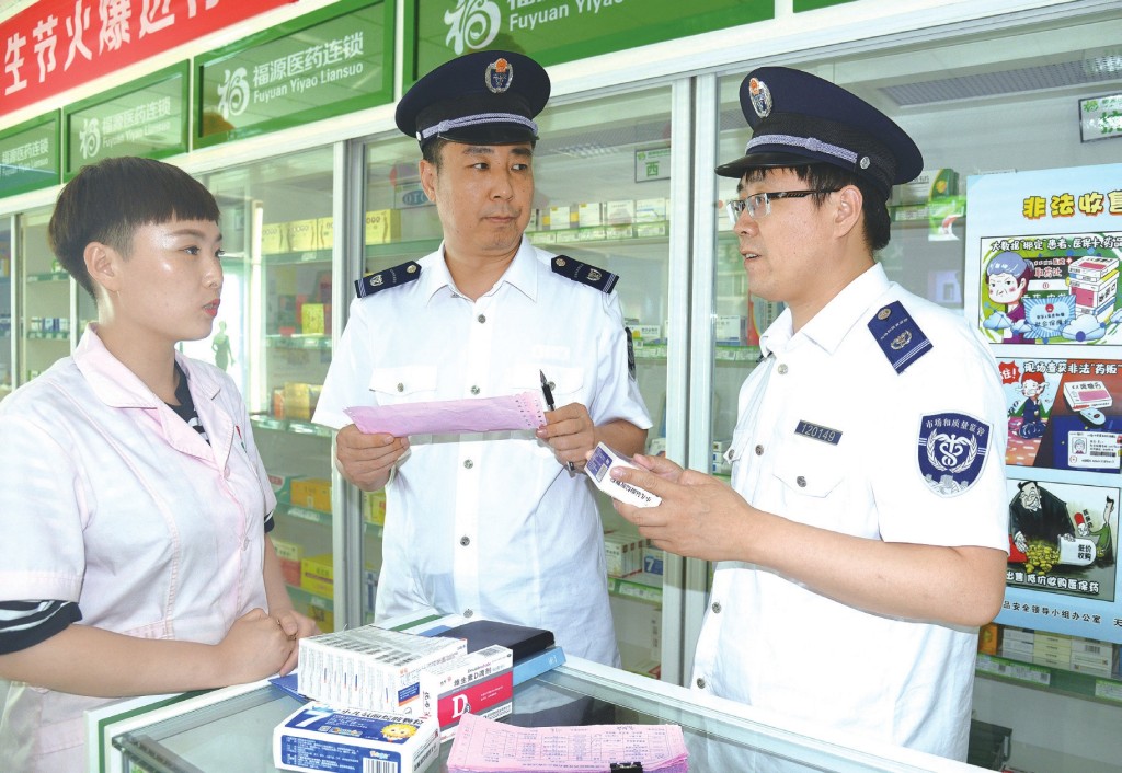 圖為執(zhí)法人員在一家藥店檢查,核對藥品進貨票據(jù)。董寶栓 攝