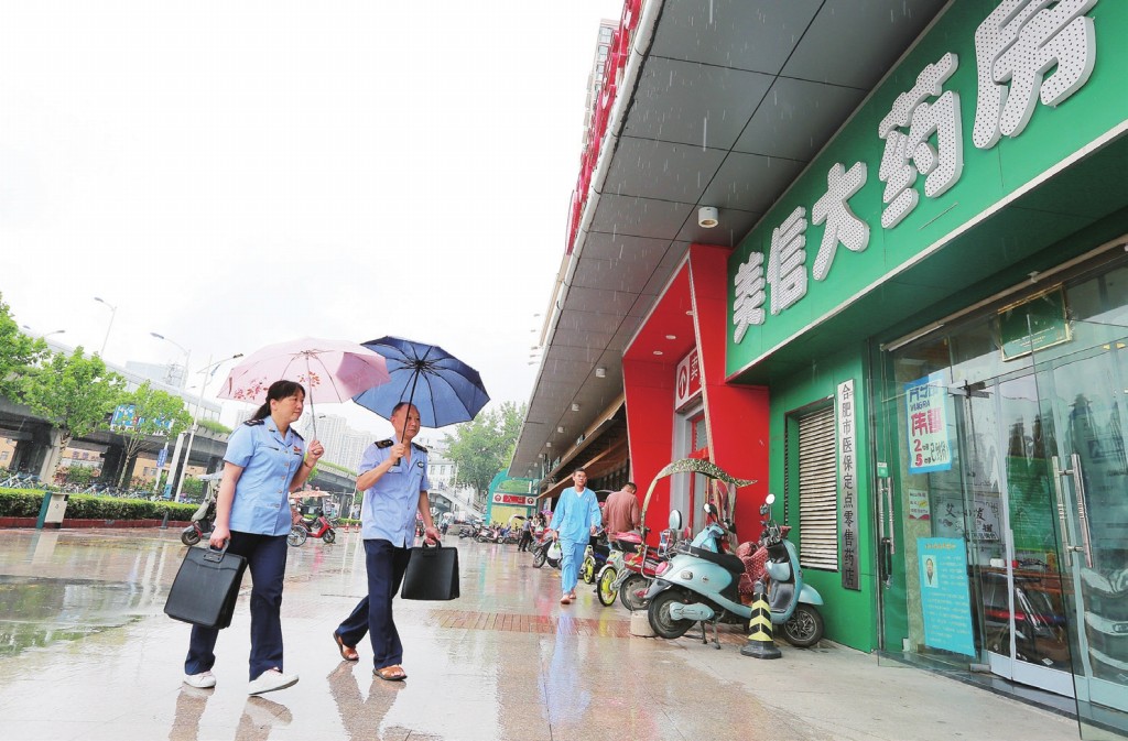 圖為6月18日,阜南縣市場(chǎng)監(jiān)管局地城監(jiān)管所執(zhí)法人員在一家藥店檢查藥品儲(chǔ)存環(huán)境溫濕度。陳明浩 康夏 攝影報(bào)道