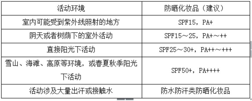 為了全面防護(hù),要選擇既能防護(hù)UVB又能防護(hù)UVA的防曬化妝品,即產(chǎn)品標(biāo)簽標(biāo)識(shí)有SPF值和PA等級(jí)或廣譜防曬的產(chǎn)品。那么是不是直接購買SPF值最大,PA“+”最多的防曬化妝品就最好呢?其實(shí)不然。雖然SPF值越大、PA“+”越多的產(chǎn)品防曬效果越好,但同時(shí)也意味著添加的防曬劑含量越高或者成分越復(fù)雜,過度使用會(huì)加重皮膚的負(fù)擔(dān),甚至還可能引起皮膚不良反應(yīng)。因此應(yīng)根據(jù)環(huán)境條件選用防曬化妝品,具體情況可參考下表。