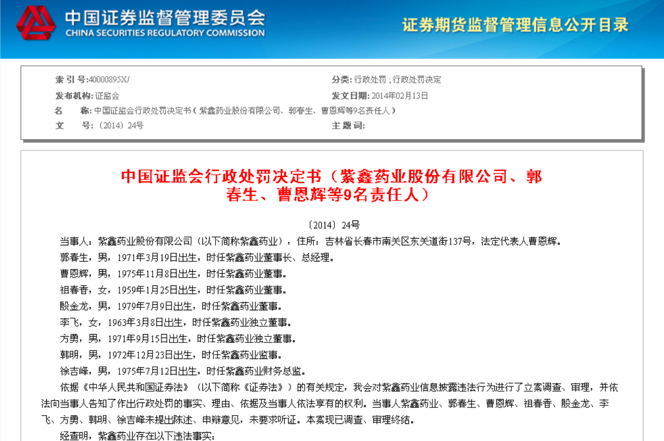 證監(jiān)會決定:一、責令紫鑫藥業(yè)改正,給予紫鑫藥業(yè)警告,并處以40萬元罰款;二、給予郭春生警告,并處以10萬元罰款;三、給予曹恩輝、祖春香、殷金龍、李飛、方勇,韓明、徐吉峰警告,并分別處以3萬元罰款。